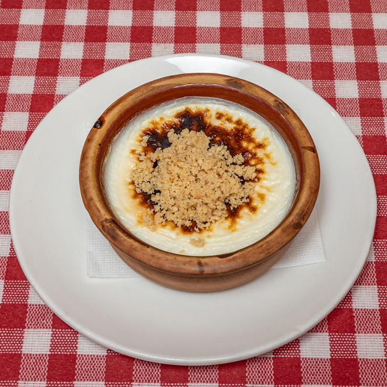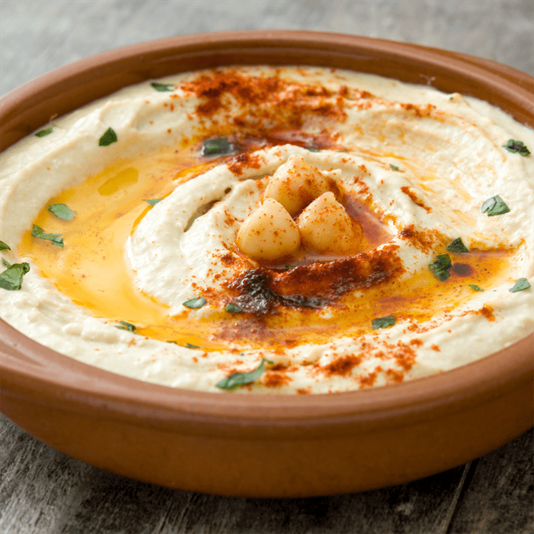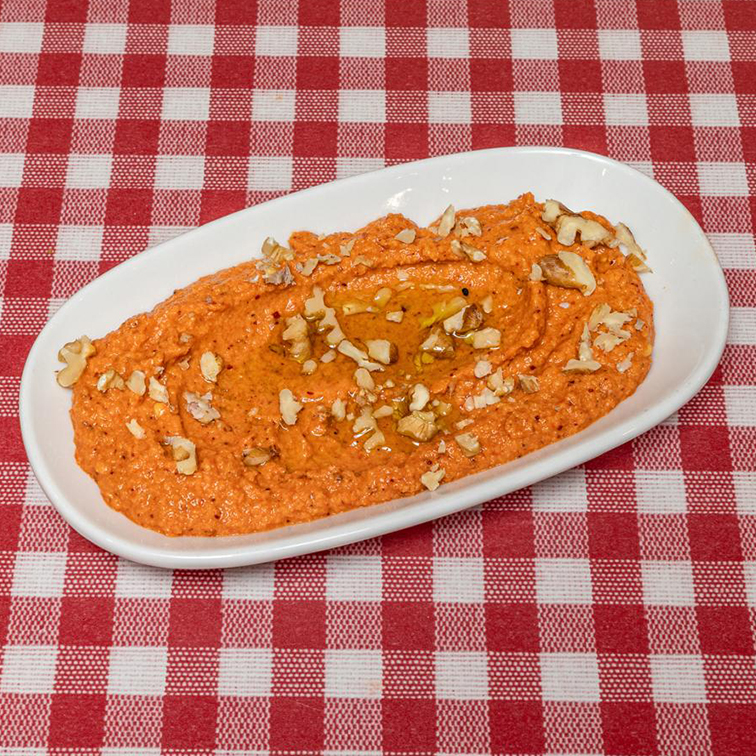 Roasted red pepers, walnut, bread crumb, pomegranate molasses, tahini, garlic and pomegranate molasses.