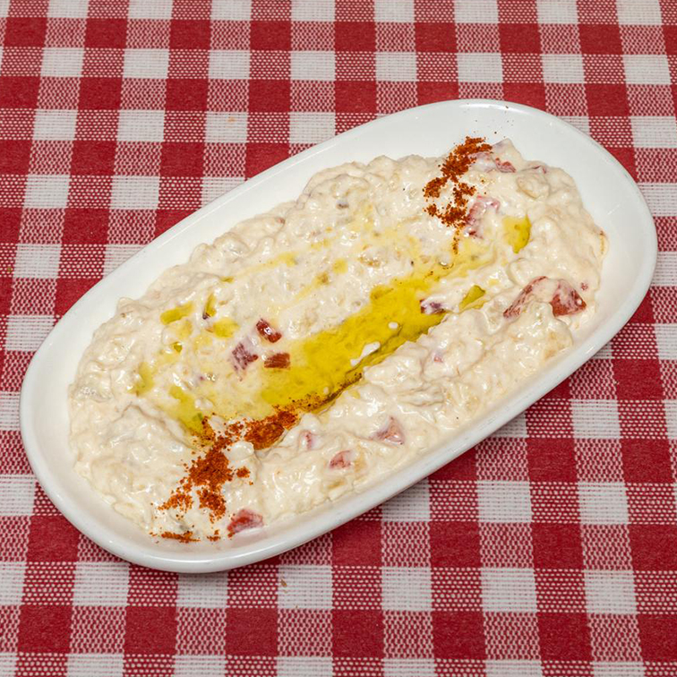 Caviar of smoked abubergine and red pepper, tahini, garlic, yoghurt, lemon and Olive oil.
