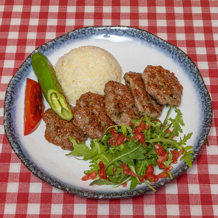 Shell or bulgar stuffed with minced beef, fresh herbs and spices served with sumac yoghurt