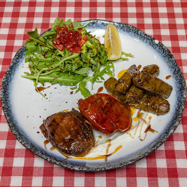 Vine leaves, sundried aubergine and peppers with rice and herbs filling, served with yoghurt and salad